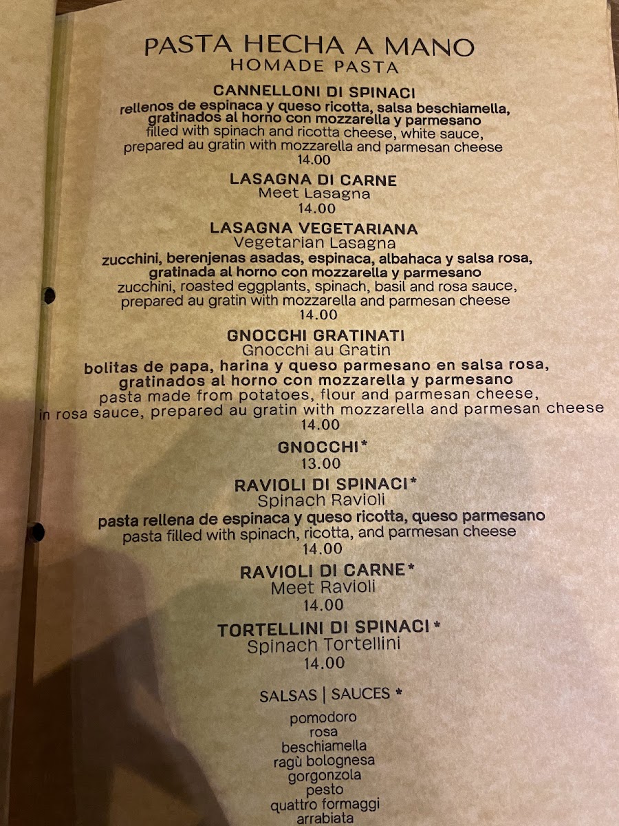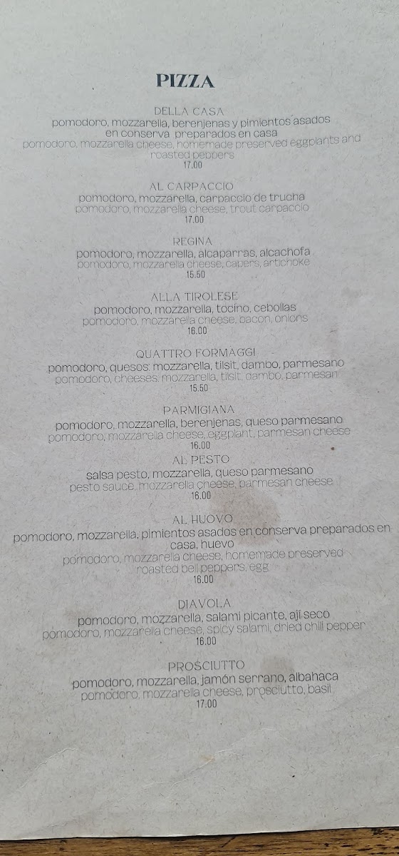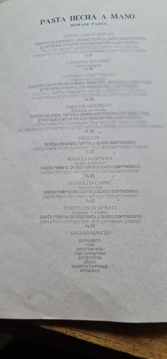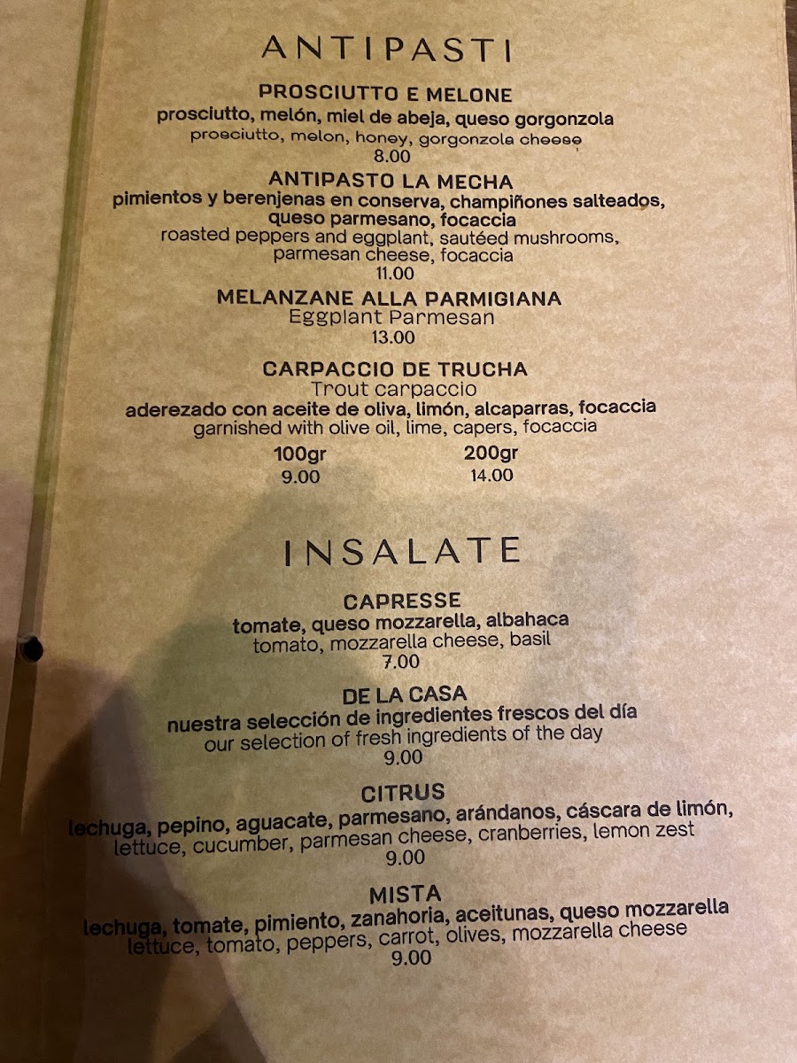 The menu at La Mecha Ristorante reflects a confident, well-balanced Italian identity that focuses on comforting classics and crowd-pleasing flavors rather than unnecessary complexity. Starters such as Bread, Al Carpaccio, Antipasto de la Mecha, and Instalata Capresse set a solid foundation, offering fresh, familiar combinations that prepare the palate without overwhelming it. The pizza selection is clearly a centerpiece of the menu, with options like Pizza Caprichosa Y Proscciutto, Capricciosa, Diavolo Pizza, Pizza de la Casa, and Pizza Peperoni showcasing a range from traditional to slightly bolder profiles, all designed to satisfy both purists and adventurous diners. Pasta dishes further reinforce the restaurant’s Italian focus, with baked and handmade options such as Gnocchi Al Horno, Gnocchi Gratinati, Lasagna Di Carne, Lasagne Con Carne, and Cannelloni Di Espinaca, each emphasizing hearty textures and rich sauces. The ravioli selection, including Ravioli Con Carne and Ravioli Di Spinaci Con Pesto, adds variety and highlights careful attention to fillings and balance. Beverage offerings like Americano Expresso, Gin Tonic, and Cervezas complement the food well, allowing guests to pair their meals with both classic and casual drink choices. Overall, the menu feels cohesive and intentional, with each dish contributing to a clear narrative of traditional Italian comfort food adapted for a relaxed dining experience, making it easy for guests to navigate and enjoy without hesitation.